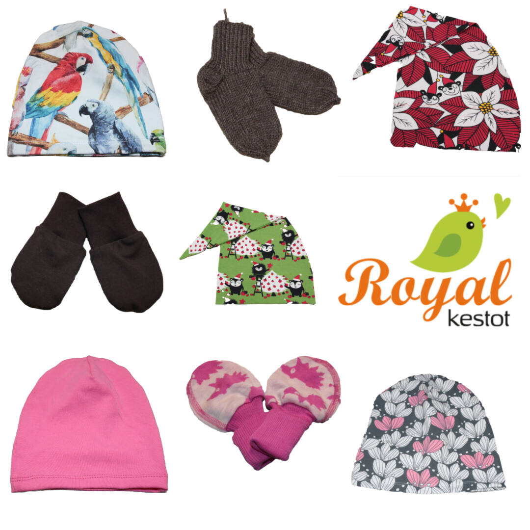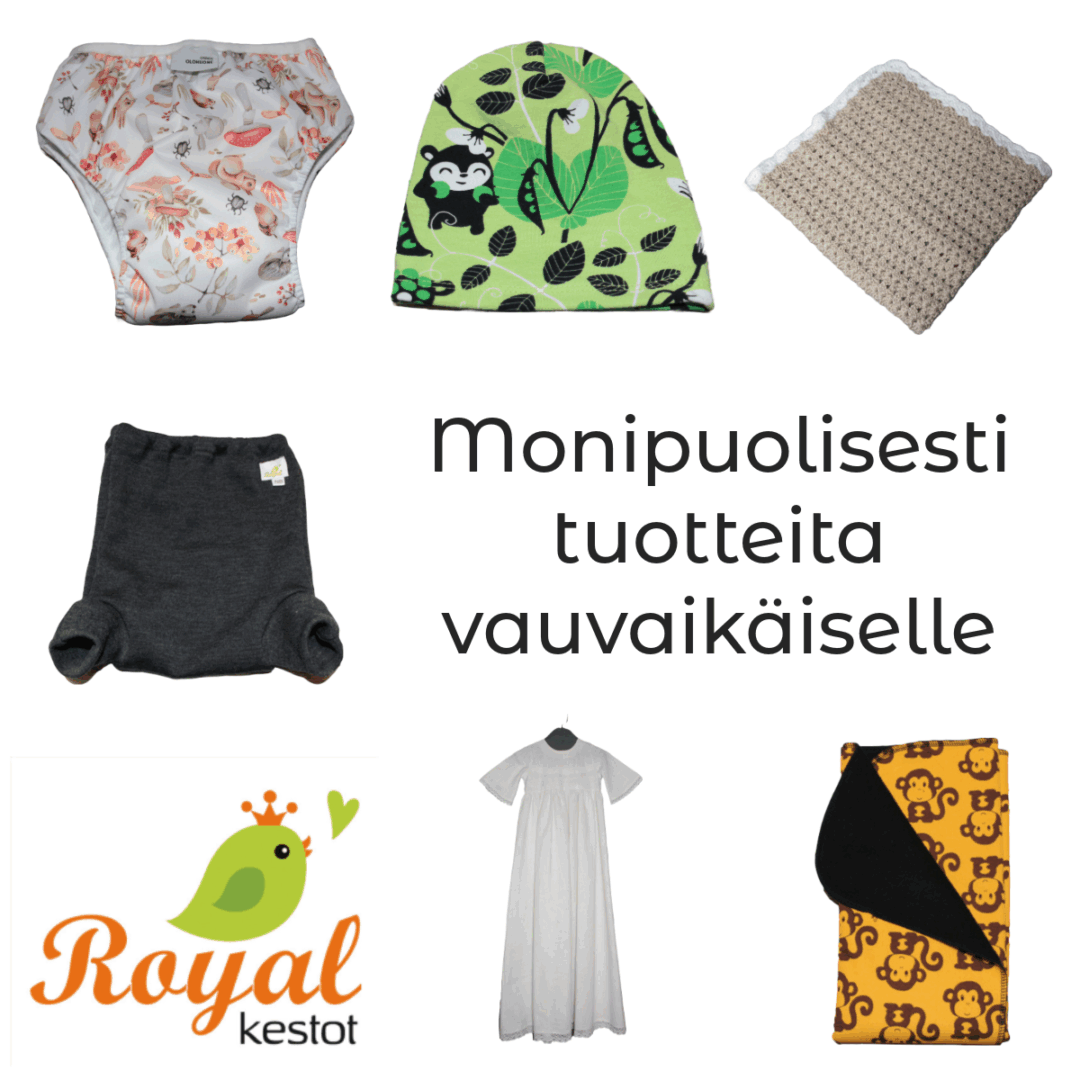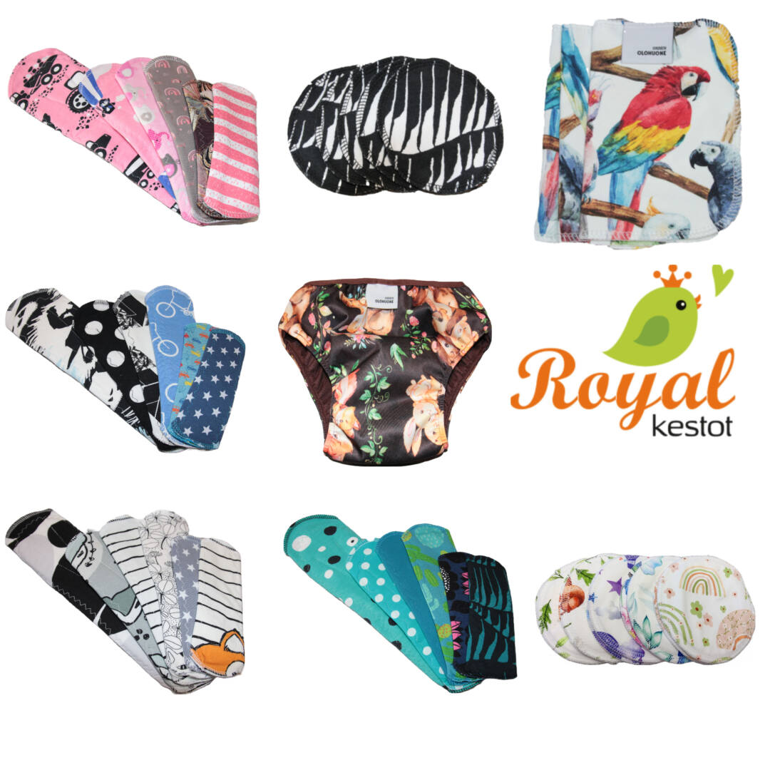 Royalkestot valmistaa kotimaisia kestositeitä viidessä koossa ja useassa materiaalissa, pestäviä liivinsuojia kevyeen ja tuhdimpaan tarpeeseen, meikinpoisto- ja pesulappuja ihon- ja vauvanhoitoon. Nämä kulkevat kätevästi mukana pikkuisissa kosteutta pitävissä pussukoissa. Keittiöön ja kaikkeen putsailuun valikoimastamme löydät trikoiset, flanelliset, bambuiset ja froteiset kestoarkit. Vauvoille valmistamme kuivaksiopetteluhousuja ja näitä kaikkia löydät myös heti valmiina postitettavaksi. Vaippapussissa kuljetat vaipat ja likaantuneet vaatteet kätevästi myös reissun päällä ja oma hoitoalusta takaa hygieenisen hoitopaikan kaikkialla. Pikkuisen juhlaan valmistamme pellavaisia kastemekkoja. Satunnaisesti valmistamme pipoja ja tumppuja sekä villalangoista neulomme sukkia ja villahousuja perheen pienimmille. Löytökorissa on nyt poistuvia tuotteita. Myymme pääosin omaa tuotantoamme ja paria muuta merkkiä oheistuotteena.