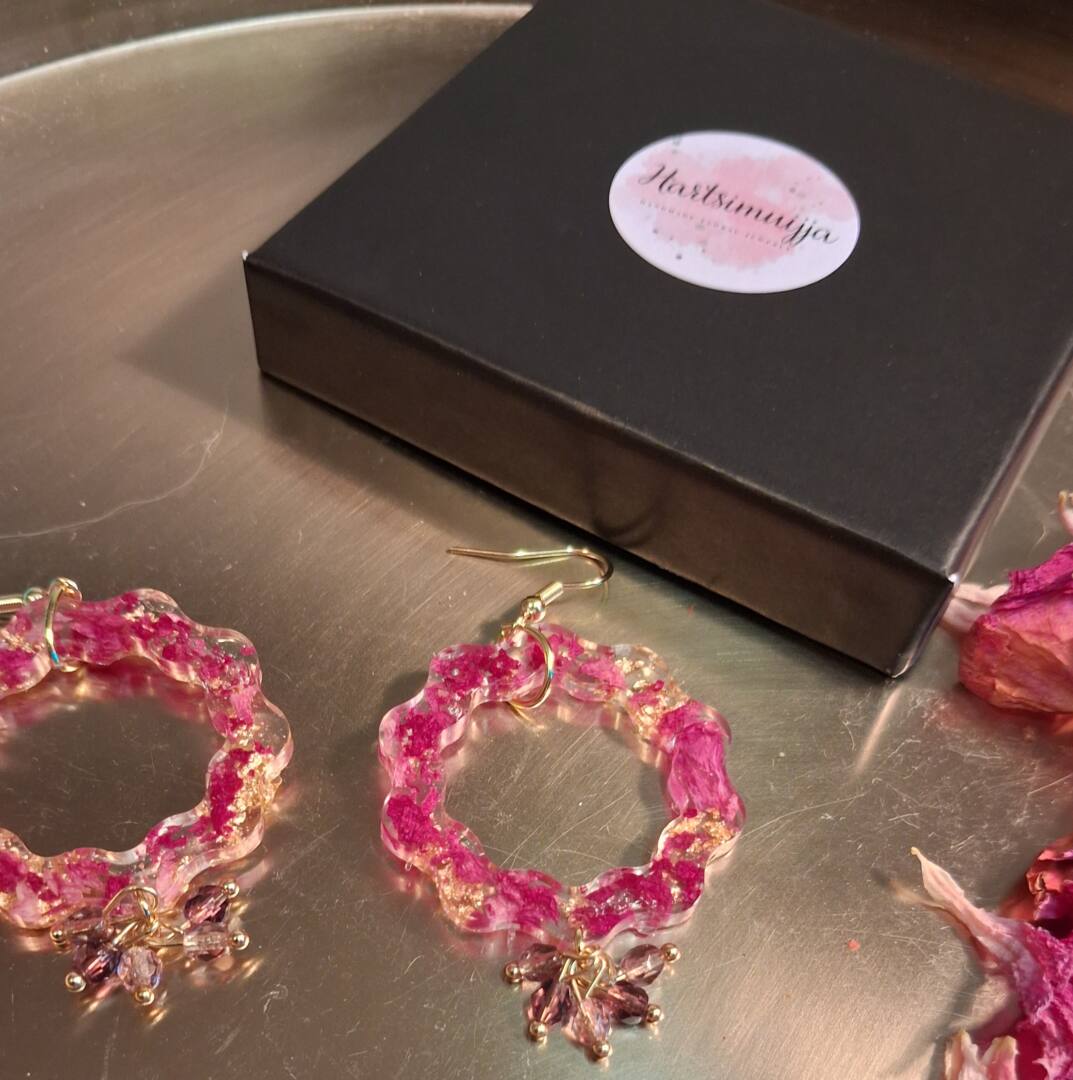 Hartsimuijja on syntynyt rakkaudesta kukkiin ja kaunisiiin korvakoruihin! Aitoja, uniikkeja ja personaallisia kuivakukkakoruja! Hartsimuijja valmistaa käsityönä koruhartsista ainutlaatuisia koruja, joiden sisään kätkeytyy pala luontoa. Valikoimasta löydät ajattomia arkikoruja, sekä näyttäviä juhlakoruja merkityksellisiin hetkiin. Korujen osat ovat nikkelitöntä kirurginterästä Kukkakoruja valmistetaan myös omien toiveita mukaan. Korun sisään voi säilöä osan omasta hääkimpusta, lapsen ristiäiskukista, mummulan kukkapenkistä tai muistoksi jostain muusta merkittävästä hetkestä. Kukkakorussa muisto säilyy vuosia. Valmiiden korutuotteiden lisäksi Hartsimuijja tarjoaa hartsikorupajoja Pirkanmaan ja Satakunnan alueella.